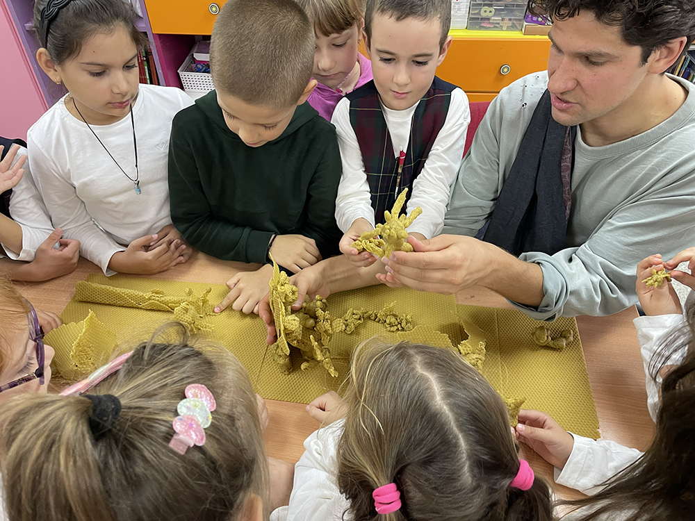 Astăzi vom pleca împreună într-o călătorie a imaginației! Vom folosi foi de ceară ca să creăm mici ființe magice sau simboluri care aduc grijă, iubire și blândețe. Poate fi un animal care protejează prietenii, o floare care luminează când cineva e trist, sau o inimă care adună bucurie. Puteți spune că, așa cum albinele repară fagurii lor cu grijă și răbdare, și noi, oamenii, putem cu blândețe să ocrotim și să vindecăm părțile din noi care au nevoie de mai multă atenție.